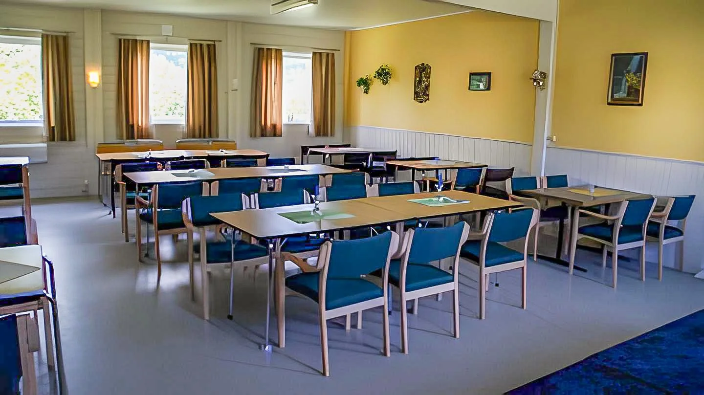 Kjøkkenet er utstyrt med kjølehjørne, kombi-kjøleskap og komfyr, oppvaskmaskin, kaffetraktere, dekketøy og bestikk for 100 personer